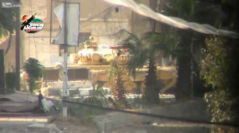 Syria - An SAA T72 crewman is almost hit by an FSA sniper round in Arbeen. 12/05/2012.