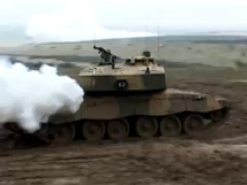 Two British Challenger tanks firing while on the move and one lays down a smoke screen.