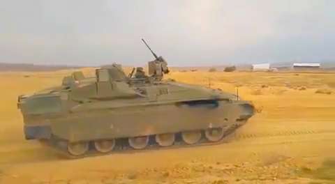 An Israeli Defense Force Namer Heavy Infantry Fighting Vehicle winds through the desert.
