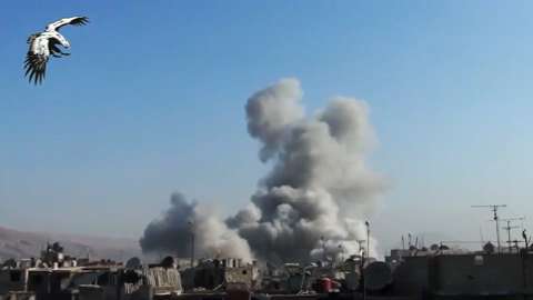 Syrian Air Foce MiG-23’s conduct air raids on the rebel held city of Douma near Damascus.
