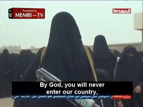 At a rally in the Al-Jawf province of Yemen, veiled Houthi women brandished weapons and protested what they called the