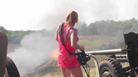 Eden Rose, AKA Lil Red Danger, fires a minigun from the hip with Degroat Tactical Armaments LLC at the Oklahoma