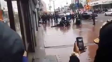 NYPD Officer attacked by ax-wielding man in Queens -- Video credit: Devon McCarthy, owner of mccarthysbooks