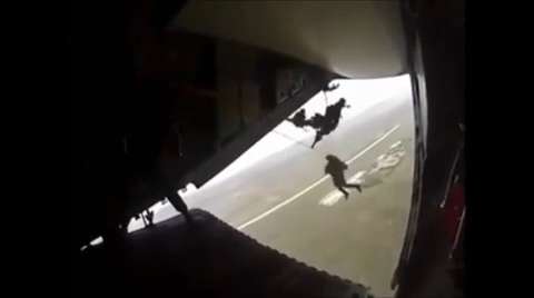 A Mexican paratrooper gets stuck on static line during jump gone wrong.