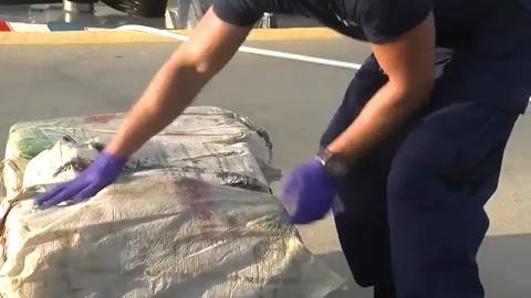 Crewmembers from U.S. Coast Guard Cutter Hawk, an 87-foot patrol boat homeported in St. Petersburg, Florida, offload 576 kilograms of