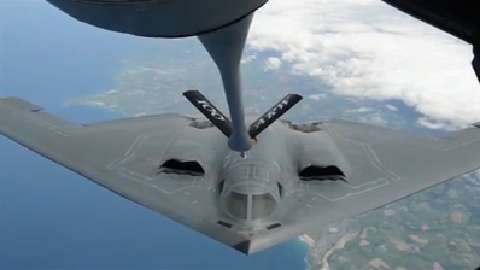 A KC-135 Stratotanker from the 100th Air Refueling Squadron at RAF Mildenhall, UK refuels a B2 Spirit stealth bomber in-flight