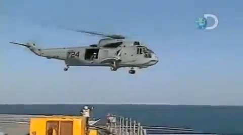 A SH-3 helicopter makes a smash landing on the stern of a destroyer ship before falling into the water.