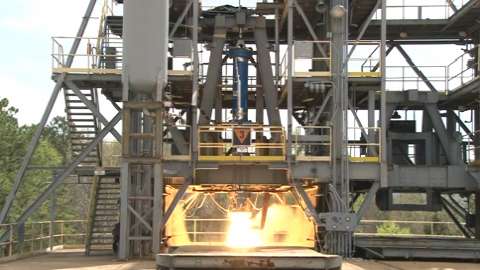 A 24-inch, two-segment solid rocket motor blazed to life with 50,000 pounds of thrust during a hot fire test. Engineers