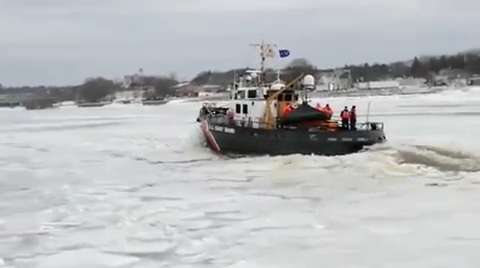 BOSTON - Coast Guard Cutters Tackle and Shackle break ice along the Penobscot River in Bangor, Maine, Feb. 21, 2013