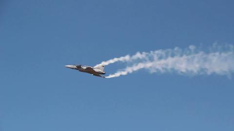 A Hungarian air force JAS-39 Gripen does a flyby with smoke on at the Kecskemét Repülőnap 2013 international air show.