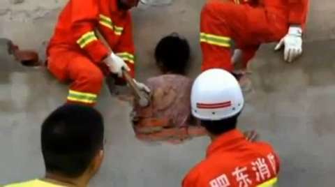 Only in Russia, oh wait, this is China. Firefighters remove a portion of a concrete wall to rescue a woman