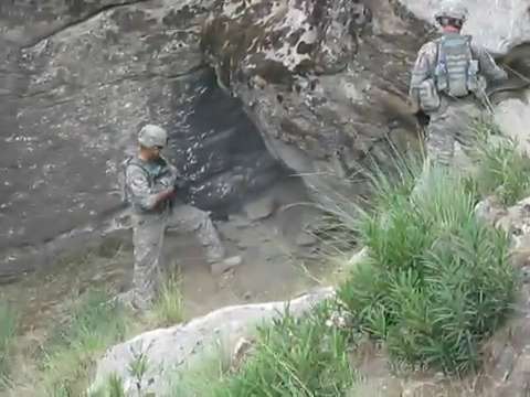 US soldier clears out a cave with a hand grenade. Afghanistan Kunar province.