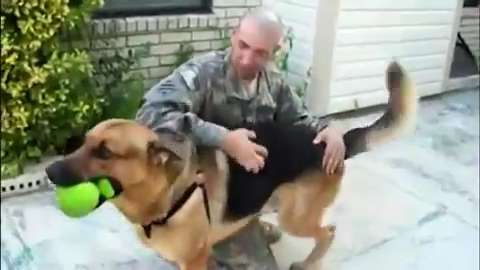 A dog fetches a ball and returns to find his owner home from deployment. Damn these onions.