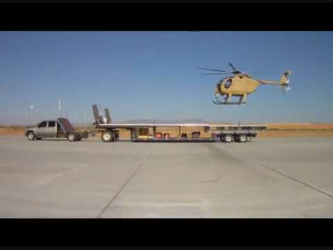 Edited Boeing video showing its Unmanned Little Bird helicopter landing autonomously on a trailer moving along a runway at speeds