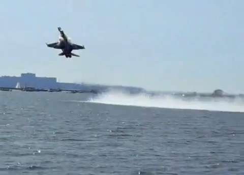 Blue Angel kicks up water up during a low pass!